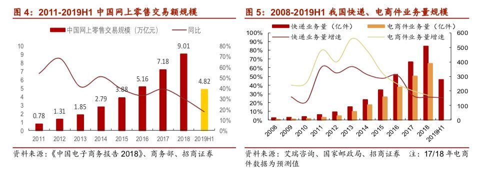 2019年上半年,全国网上零售额达4.81万亿元,同比增长17.8%,保持较强韧性。我国快递业务量从2008年的15.1亿件增长至2018年的507亿件,年复合增速达到+42.1%。