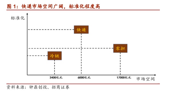 在物流领域的各个子版块中,快递标准化程度最高,易于复制和快速扩张。在物流领域中,冷链的标准化程度最低,主要因为不同商品对于冷藏冷冻的温度要求不同,难以制定统一的标准。
