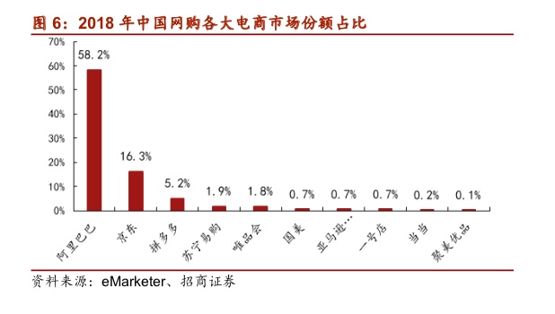 当前阿里巴巴、京东居第一梯队,合占四分之三电商市场份额。根据eMarketer,2018年中国电商零售市场份额中,阿里巴巴以58.2%占据首位,京东销售额占17.3%,两家电商合计占据75.5%市场份额。