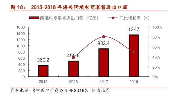 跨境物流发展迅猛。2018年我国跨境电商持续快速发展,跨境网络零售迅速增长。2018年中国海关验放的跨境电商零售进出口额为1347亿元,同比增长50%,其中出口561.2亿元,增长67%,进口785.8亿元,增长39.8%。