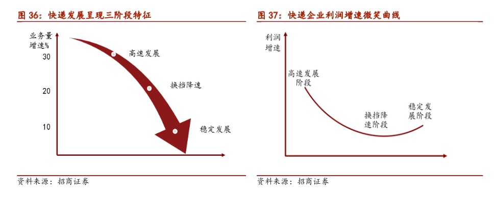 3)第三阶段:稳定发展阶段。经历第二阶段激烈的市场竞争,市场参与者减少,行业集中度进一步提升,虽然全社会网购需求增速放缓,但快递市场供需重新平衡。寡头垄断将使得龙头公司议价能力提升,利润增速回升。此时行业竞争氛围相对缓和。