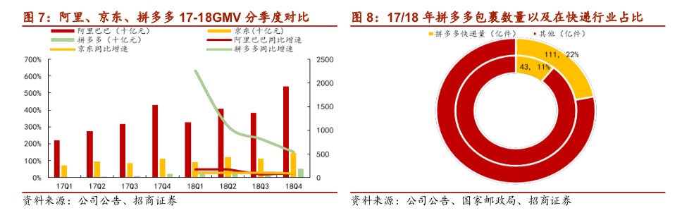 截至2018年底,拼多多活跃买家屡创新高,达到4.18亿人;2018全年GMV达到4716亿元,累计环比增速保持在36%左右,增长迅猛;件量为121亿件,占国内快递件量的26.7%左右。