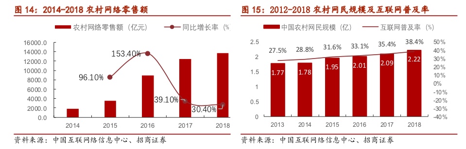 另一方面,从互联网普及率来看,中国农村地区互联网普及率仅为38.4%,虽然同比提升3pcts,但仍远低于城镇普及率,农村电商更是一片蓝海。