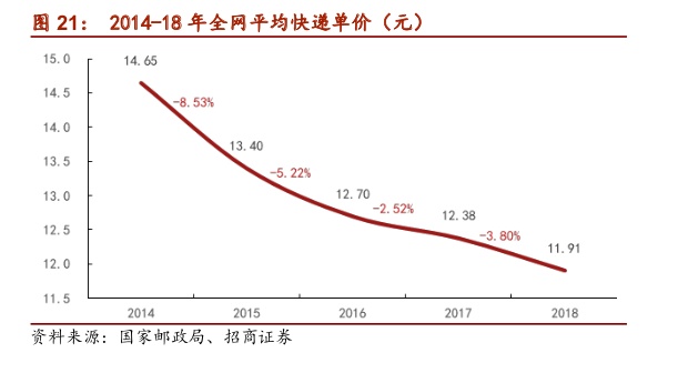 2018年全网快递单票价格为11.91元,同比下降3.8%,2017年单价同比下降2.6%。2018年市场单价降幅高于去年下降幅度,整体上2018年价格竞争加剧。2019年以来,剔除春节对票价的扰动,单月票价仍在持续走低。