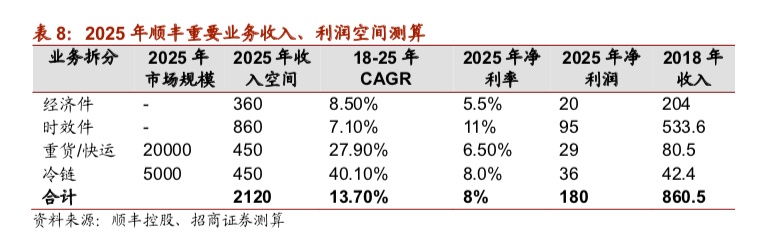 长期来看,我们判断顺丰四大业务具有较大市场空间,预计2025年合计收入达2120亿元,贡献净利润超180亿元。
