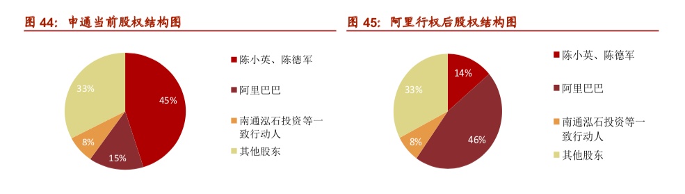 在2019年初,阿里巴巴通过实际控制人设立的新公司间接持有申通快递14.65%股权。因此结合投资人此次全部行权,阿里巴巴将共持有上市公司46%的股权。