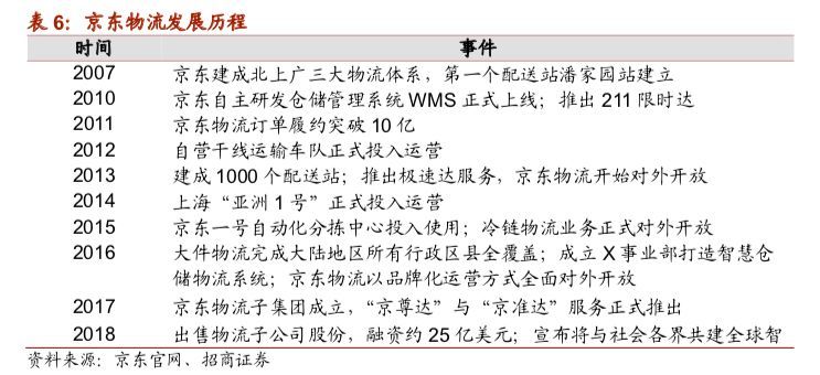 京东开创“物流+电商”新模式,智慧物流加速赋能全网。京东物流始于07年,最初时以北上广为三大物流体系中心;从12年起以自营车队进行运输配送;14年时高度自动化的“亚洲一号”投入运营,并且不断致力于智慧仓储系统的研发;18年初完成国内物流行业的最大单笔融资25亿美元。