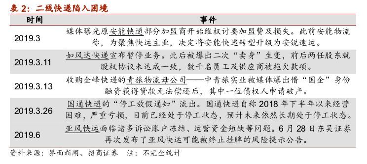 在成本控制及业务规模上,二线快递企业与头部企业的的差距将越来越大,中小快递企业的生存空间也会越来越小。2019年,如风达快递、国通快递纷纷陷入困境,被迫停工。