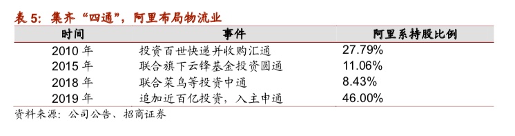 百世在上市之前获得了阿里巴巴系合计6轮的融资,阿里巴巴系的股份占比在其2015年投资圆通,目前累计持股11.06%。2015年,阿里巴巴联合旗下云锋基金投资圆通,当时持股约11%。2016年10月圆通借壳上市。