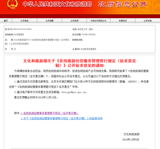 (网经社讯)近日,文化和旅游部发布关于《在线旅游经营服务管理暂行规定(征求意见稿)》公开征求意见的通知(以下简称为“暂行规定”),针对“大数据杀熟”、“低价游”、“非法删评论”等当前业内存在的热点问题,都做出了具体规定。