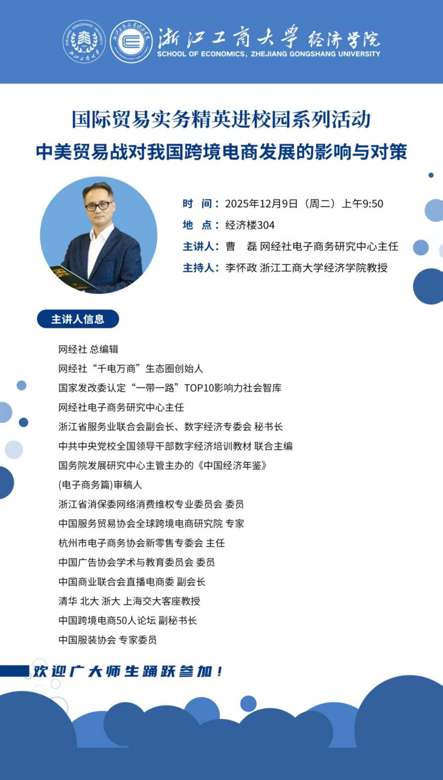 12月9日,网经社电子商务研究中心主任曹磊受邀至浙江工商大学,以《中美贸易战对我国跨境电商发展的影响与对策》为主题,为现场老师及本硕博学生带来专业授课。