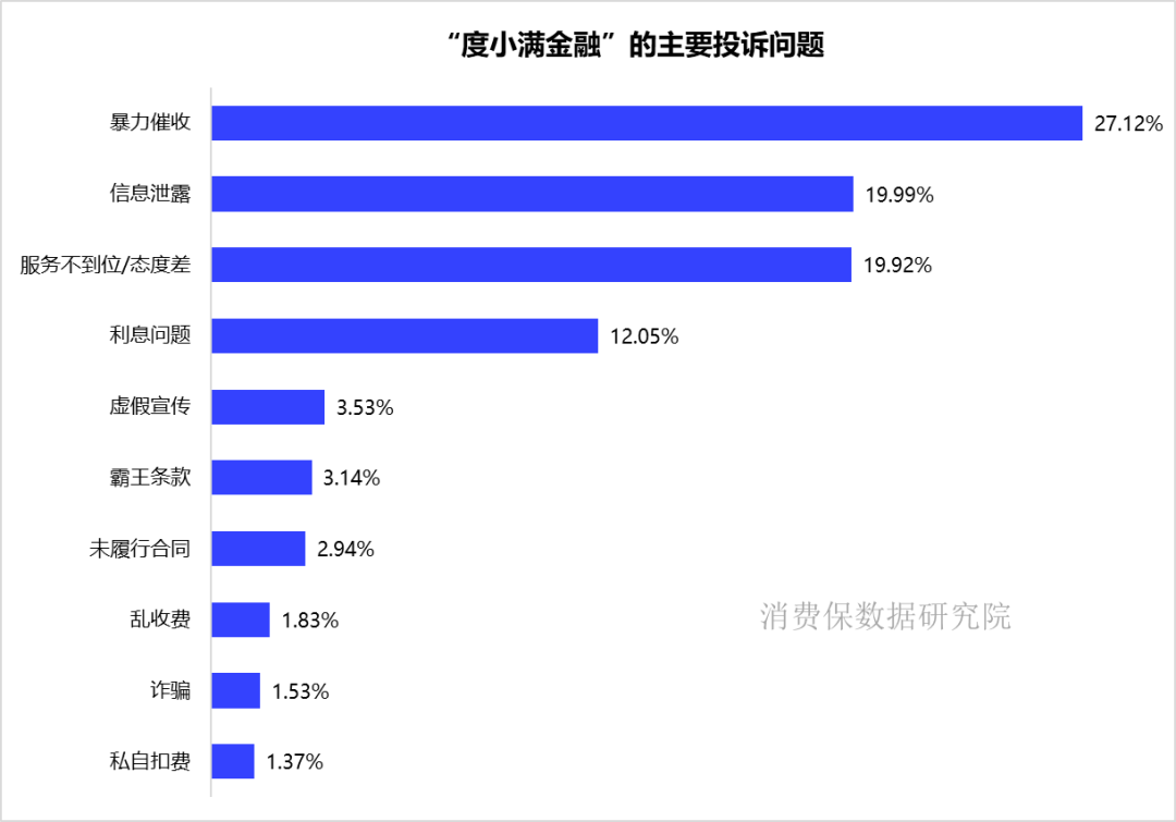 2025年,消费保平台累计受理度小满金融相关投诉共 3355 件,涉诉总金额达 6870.98 万元。投诉问题高度集中:暴力催收以27.12%居首,信息泄露(19.99%)、服务不到位/态度差(19.92%)分列二、三位。