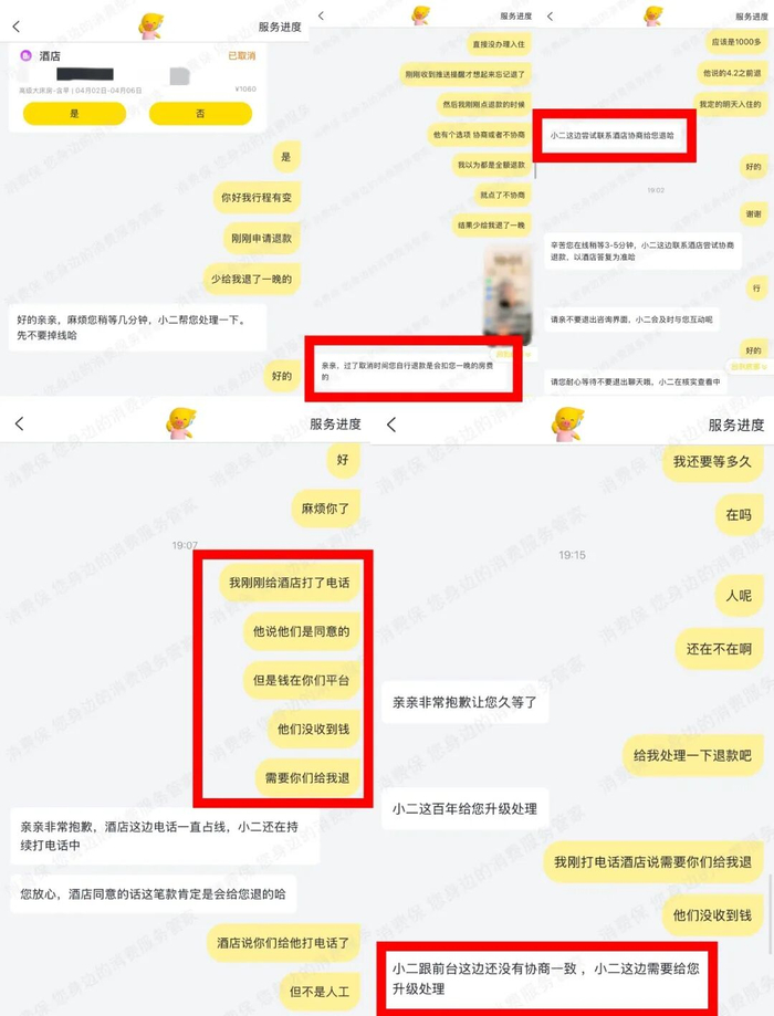 她联系飞猪在线客服询问原因,对方称会致电酒店协商退回,但迟迟没有回复。于是张女士自己打电话询问酒店,经张女士解释后,酒店表示同意全额退款,并说明平台扣除的那一晚房费酒店并未收到,建议她找平台处理。
