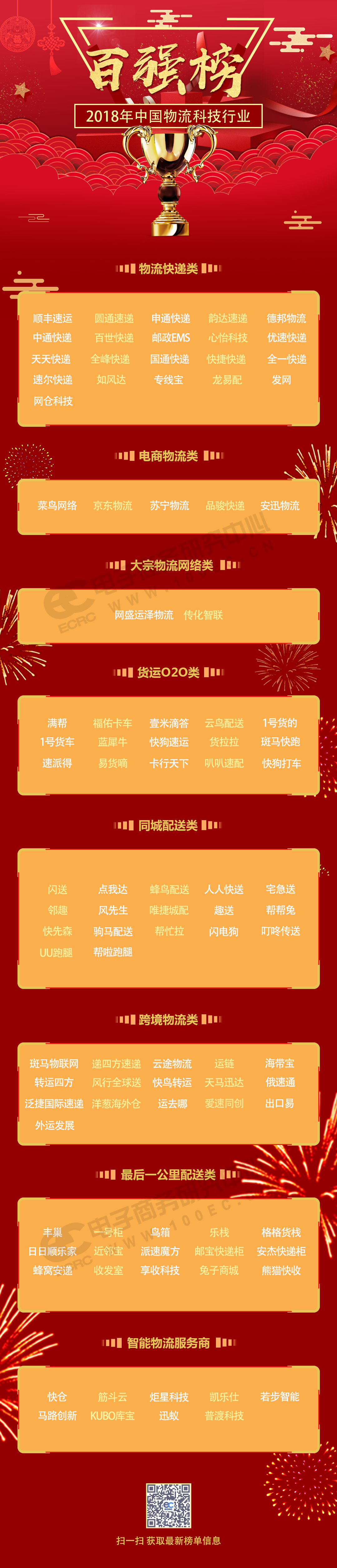 为褒扬物流科技行业先进、树立行业标杆典型,更好的推动行业发展。在2019年伊始之际,我国“一带一路”TOP10影响力社会智库网经社-电子商务研究中心(微信ID:i100EC)特别发布《2018年中国物流科技行业百强榜》。而在2018年12月18日,为庆祝改革开发40周年、电商20年之际,中心还特别发布《改革开放40周年、电商20年:100位中国电商功勋人物榜单》。