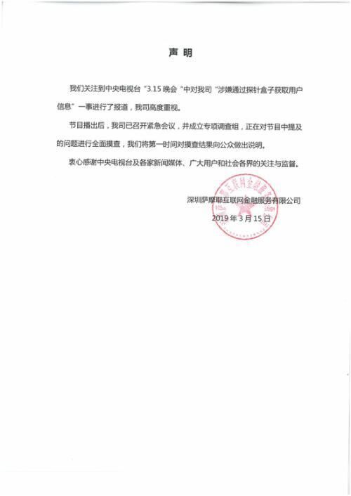 回应:萨摩耶互联网金融科技有限公司回应称已成立专项调查组对节目中提及的问题全面排查。