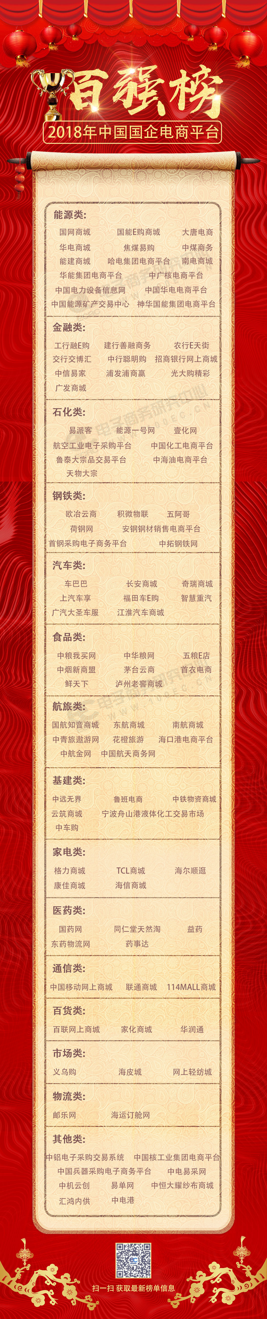 该榜单经过专注于电商研究十余年的网经社-电子商务研究中心根据平台GMV、营收、利润、行业影响力等指标综合评估而定,旨在反映当前国企电商行业发展概况。榜单由能源、金融、石化、钢铁、汽车、食品、航旅、基建、家电、医药、通信、百货、市场、物流其他共15类构成共100家平台,上榜平台均为各领域国企在电商领域发展的领先平台。同时为国企电商平台提供包括:品牌宣传、战略顾问、高层内训、咨询诊断、项目报告等专业服务。国企发展电商原因、优势、问题及建议详见>>