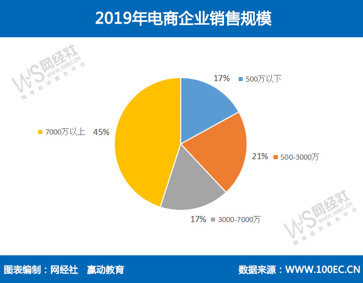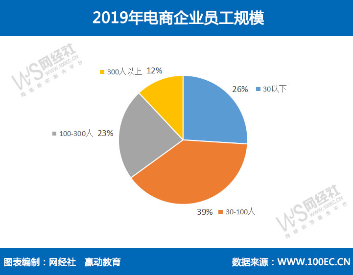 数据解读和2018年相比,电商企业员工规模有了小幅度的提高,其中,30人以下的比例下降了3%,300人以上的比例提高了4%。
