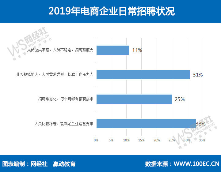 数据解读56%的电商企业处于招聘常态化或人才需求强烈的状态,相比其他行业,电商行业人才需求仍然旺盛。相比2018年,人员比较稳定,能够满足运营需求的比例上升了4%,说明企业在人才建设方面有了一定的提升。