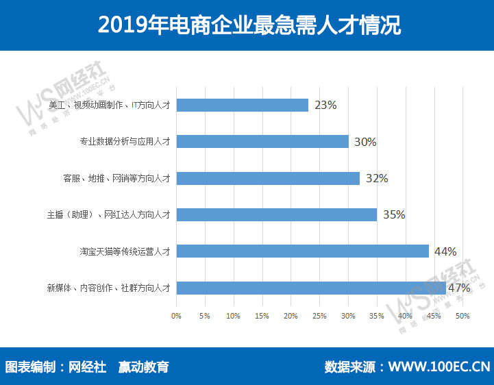 被调查企业中,47%的企业急需新媒体、内容创作、社群方向人才;44%的企业急需淘宝天猫等传统运营人才。35%的企业急需主播(助理)、网红达人方向人才;32%的企业急需客服、地推、网销等方向人才;30%的企业急需专业数据分析与应用人才。