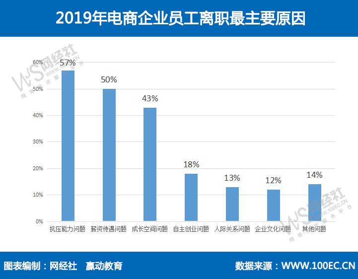 2、人才是企业的核心要素,一般情况,超过20%的年流失率就会给企业造成实质性影响。而2019年,有43%的电商企业流失率超过了20%。而薪酬福利问题、成长空间问题、员工抗压问题成为离职的3大原因,企业要在这些方面多下功夫。