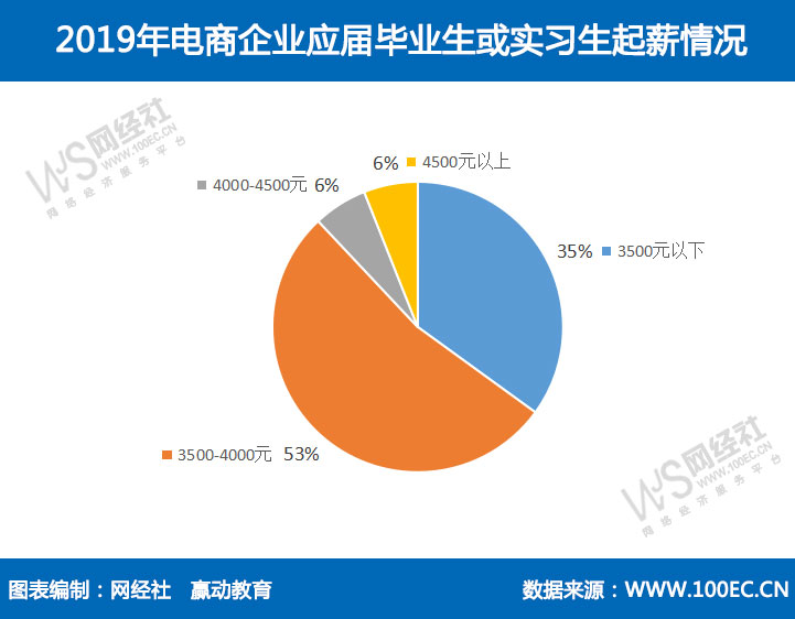 被调查企业中,企业录用的应届毕业生或实习生的起薪3500元以下占35%;3500-4000元占53%;4000-4500元占6%;4500元以上占6%。
