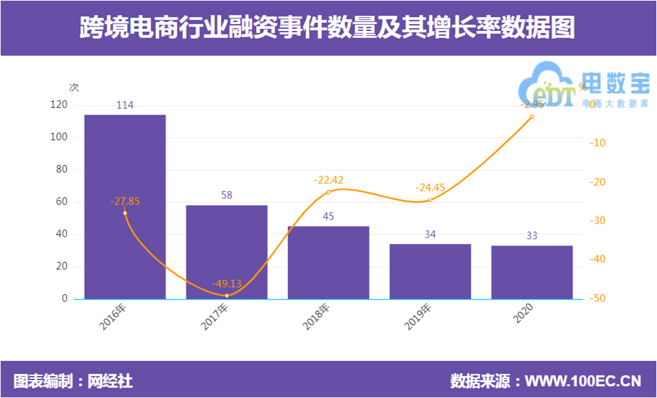 据网经社“电数宝”电商大数据库显示,2020年中国跨境电商共发生33起融资,同比下降2.95%。
