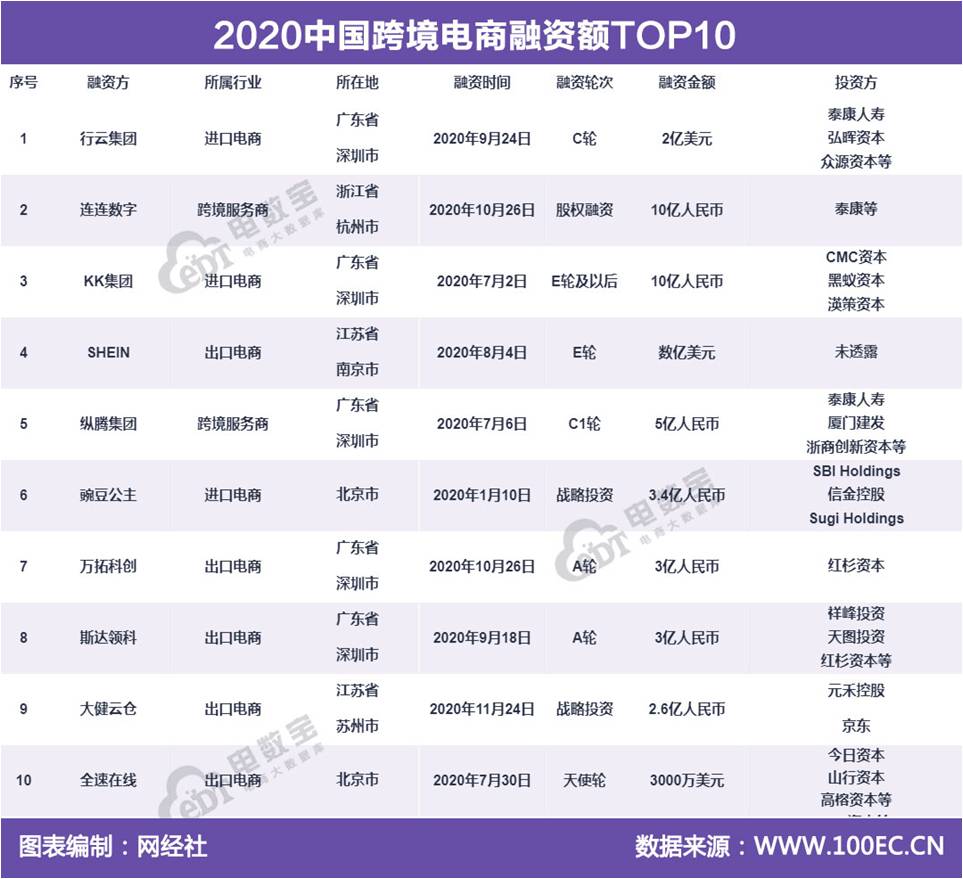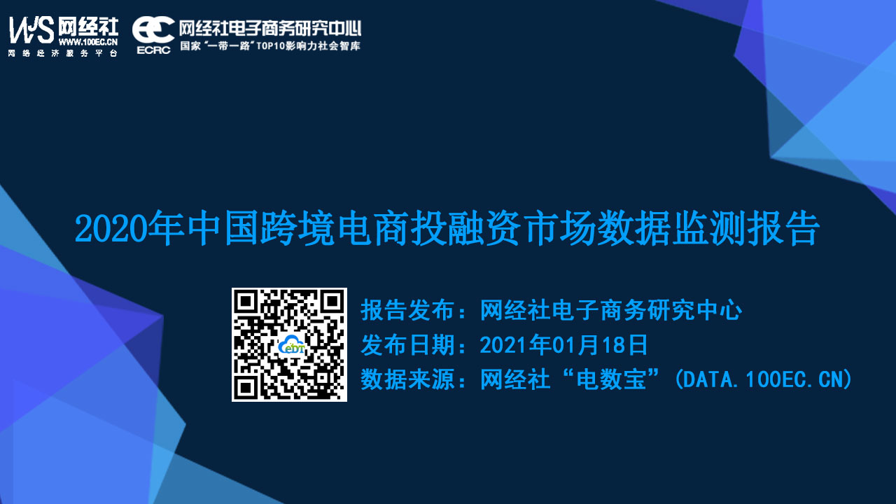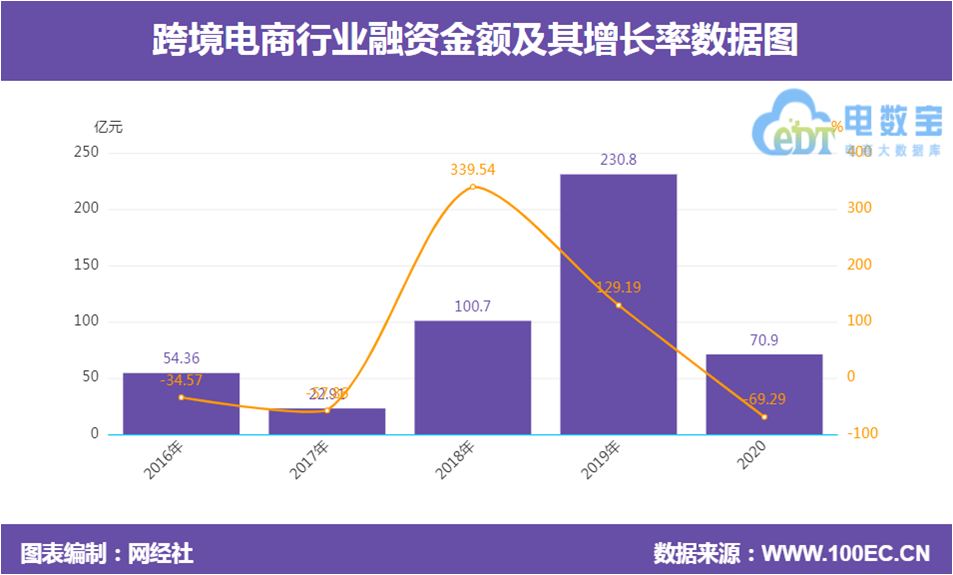 据网经社“电数宝”电商大数据库显示,2020年中国跨境电商融资总额超70.9亿元,同比下降69.29%。