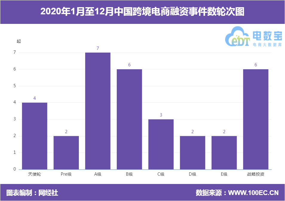 “电数宝”电商大数据库显示,2020年中国跨境电商共发生33起融资。其中,天使轮4起、Pre轮2起、A轮7起、B轮6起、C轮3起、D轮2起、E轮2起、战略投资6起。