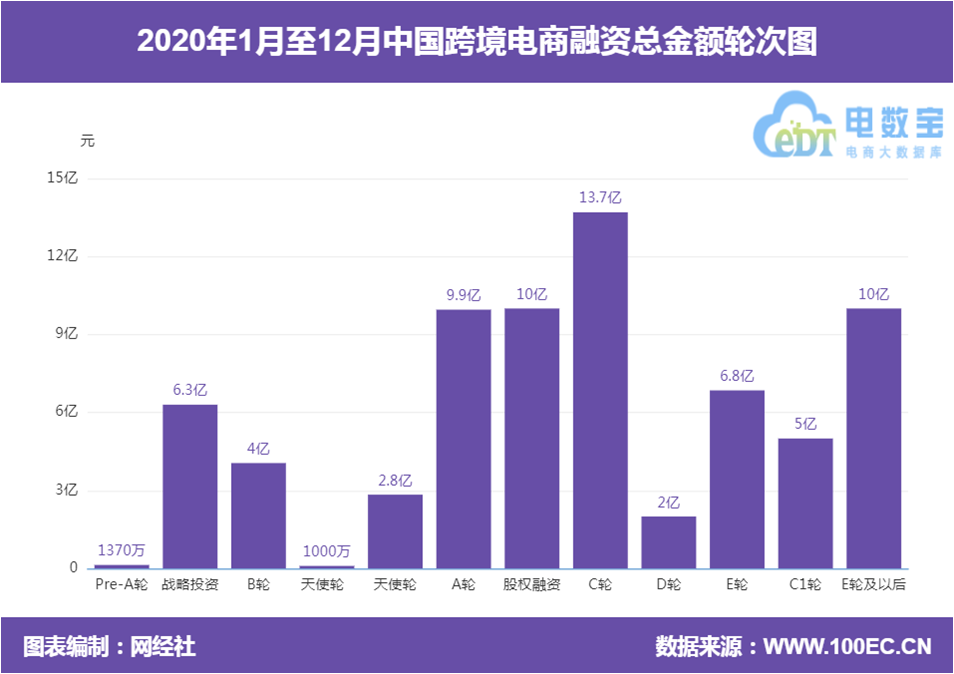 “电数宝”电商大数据库显示,2020年中国跨境电商总融资金额70.9亿元。其中,C轮融资金额13.7亿元排名第一,其次为股权融资和E轮及以后均为10亿元、A轮为9.9亿元。