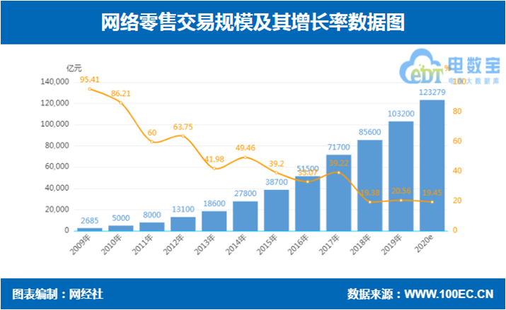 据网经社“电数宝”(DATA.100EC.CN)电商大数据库显示,2020年上半年,国内网络零售市场交易规模达5.36万亿元,预计2020年全年网络零售达12.33万亿。