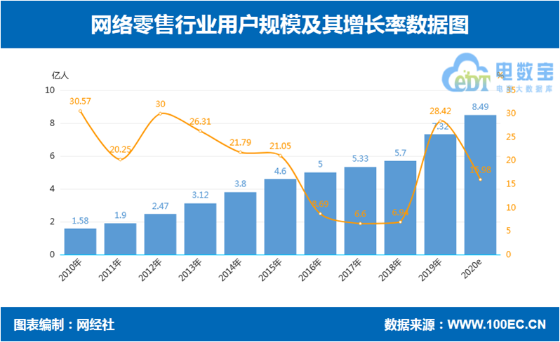 据网经社“电数宝”电商大数据库显示,2019年国内网络零售用户规模达7.32亿人,预计2020年用户规模达8.49亿人,同比增长15.98%。