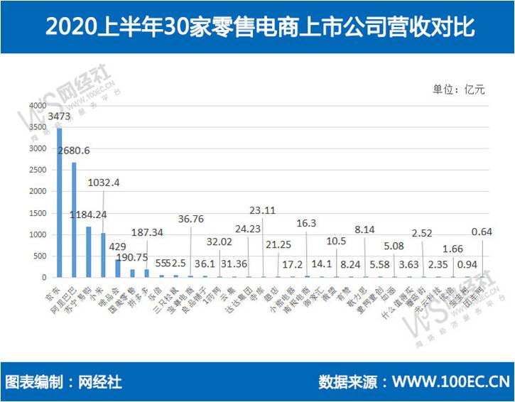 营收百亿元以上为:京东3473亿元、阿里巴巴2680.6亿元、苏宁易购1184.24亿元、小米1032.4亿元、唯品会429亿元、国美零售190.75亿元、拼多多187.34亿元。