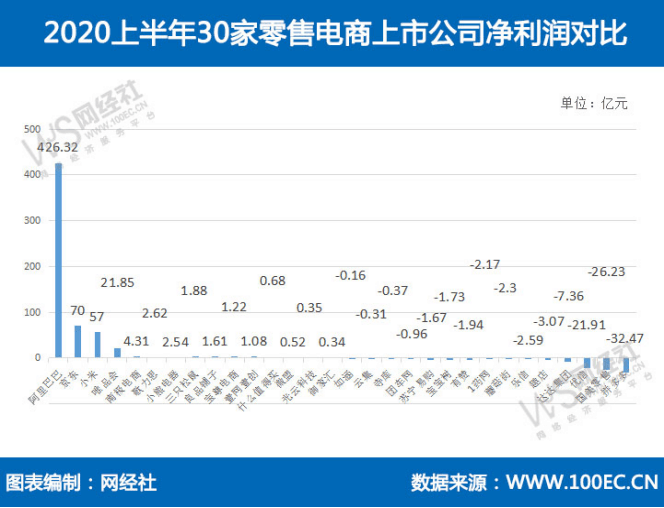 净利润为正的为:阿里巴巴426.32亿元、京东70亿元、小米57亿元、唯品会21.85亿元、南极电商4.31亿元、歌力思2.62亿元、小熊电器2.54亿元、三只松鼠1.88亿元、良品铺子1.61亿元、宝尊电商1.22亿元、壹网壹创1.08亿元、什么值得买0.68亿元、微盟0.52亿元、光云科技0.35亿元、御家汇0.34亿元。