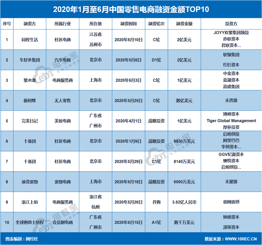 2020上半年零售电商十大融资事件分别为:同程生活(2亿美元)、车好多集团(2亿美元)、聚水潭(1亿美元)、便利蜂(数亿美元)、完美日记(1亿美元)、十荟团(8830万美元)、十荟团(8140万美元)、波奇宠物(6000万美元)、浙江上佰(3.62亿元)、全球骑士特权(数千万美元)。