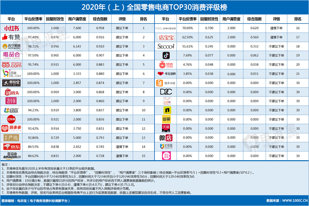 其中,小红书、有赞、苏宁易购、唯品会、当当、i百联、微拍堂、洋码头、达令家、绿森商城、红布林、拼多多、网易严选共13家上榜,获“建议下单”评级;京东、亚马逊中国、FEELUNIQUE、店宝宝共4家获“谨慎下单”评级;