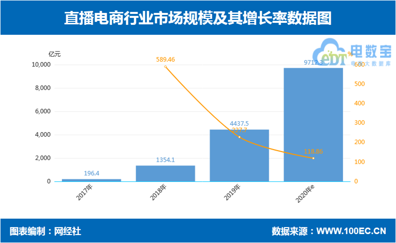 据网经社”电数宝“电商大数据库显示,2017-2019年,国内直播电商市场交易规模分别为:196.4亿元、1354.1亿元、4437.5亿元。2020年上半年,直播电商交易规模达4561.2亿元,预计全年交易规模达到9712.3亿元,直逼万亿大关。