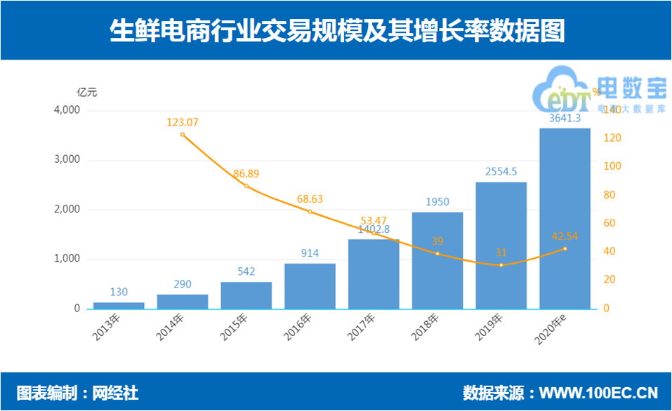 受疫情影响,2020年上半年生鲜电商迎来一波回升。预计2020年交易规模约为3641.3亿元,同比增长42.54%。