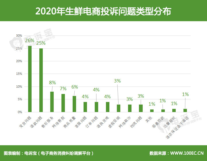 据国内电商专业消费调解平台“电诉宝”(315.100EC.CN)受理用户维权案例显示,发货问题、退款问题、售后服务、网络售假、商品质量是2020年全年生鲜电商投诉的主要问题。