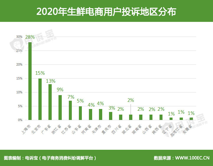 2020年全年投诉生鲜电商的用户集中地前三依次为上海市、北京市、广东省,占比分别为28%、15%、13%。