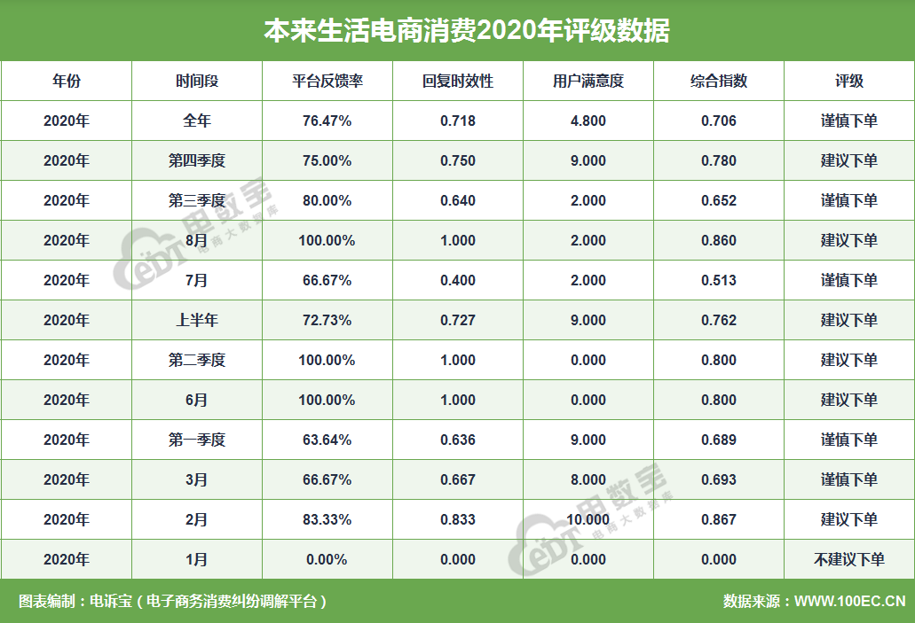 据“电数宝”显示,2020年北京本来工坊科技有限公司旗下“本来生活”共获得12次消费评级,其中,获1次“不建议下单”评级,5次“谨慎下单”评级,6次“建议下单”评级,综上所述,2020年全年整体消费评级为“谨慎下单”。