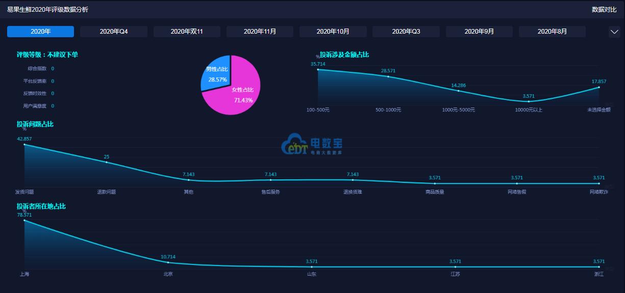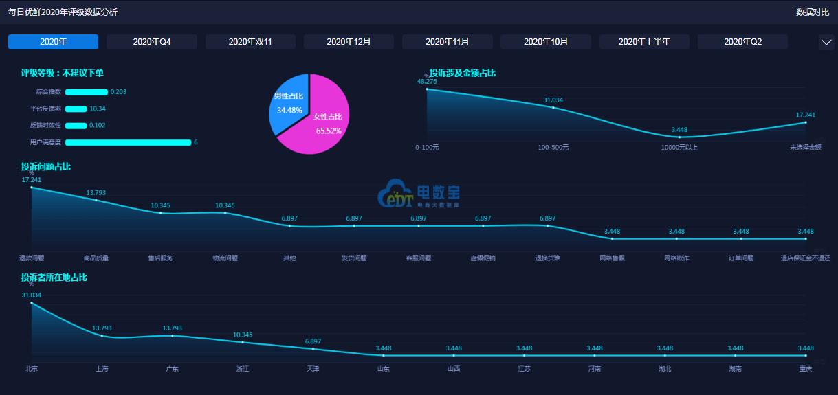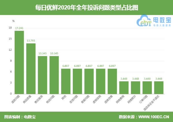 据“电数宝”显示,“每日生鲜”存在退款问题、商品质量、售后服务、物流等问题。