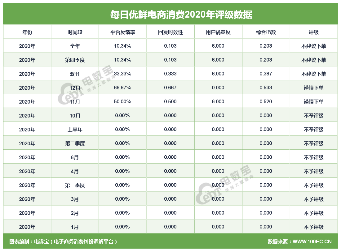 据“电数宝”显示,2020年北京每日优鲜电子商务有限公司旗下“每日优鲜”共获得14次消费评级,其中,获12次“不建议下单”评级,2次“谨慎下单”评级,综上所述,2020年全年每日优鲜整体消费评级为“不建议下单”。