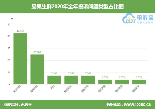 据网经社“电数宝”电商大数据库(DATA.100EC.CN)显示,“易果生鲜”存在发货问题、退款问题、售后服务、退换货难等其他问题。