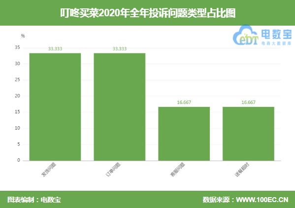 据网经社“电数宝”电商大数据库(DATA.100EC.CN)显示,“叮咚买菜”存在发货问题、订单问题、客服问题和送餐超时的问题。