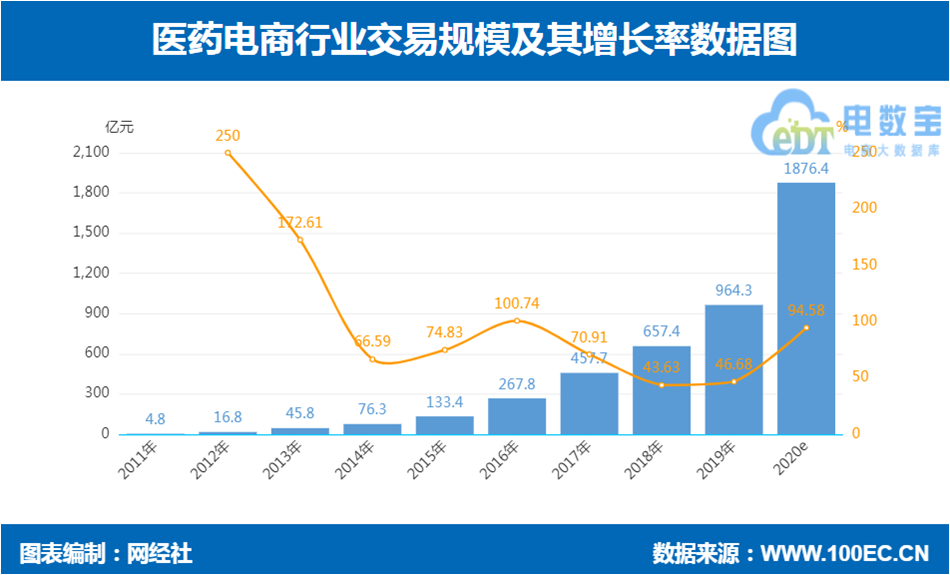 据网经社“电数宝”(DATA.100EC.CN)电商大数据库显示, 2019年我国医药电商交易规模达到964.3亿元,同比增长46.68%。受疫情影响,医药电商热度上涨,预计2020年医药电商交易规模将直逼2000亿大关,达1876.4亿元,增长94.58%。