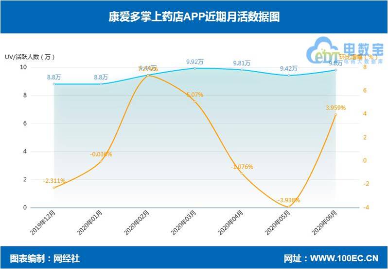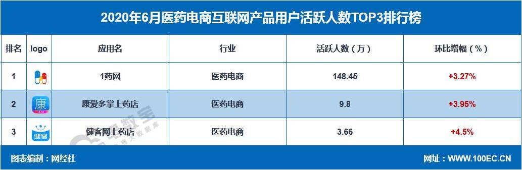 据网经社“电数宝”电商大数据库显示,截止2020年6月医药电商活跃人数TOP3分别为:1药网、康爱多、健客网。