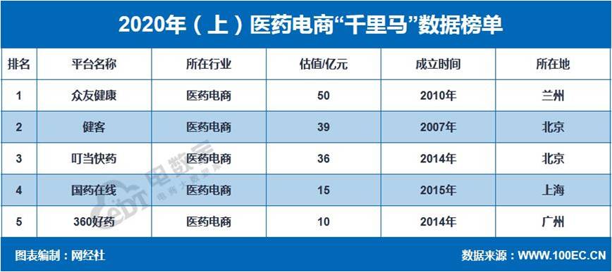 据网经社“电数宝”电商大数据库显示, 2020年上半年医药电商千里马五家,分别为众友健康(50亿元)、健客(39亿元)、叮当快药(36亿元)、国药在线(15亿元)、360好药(10亿元),总估值为150亿元。