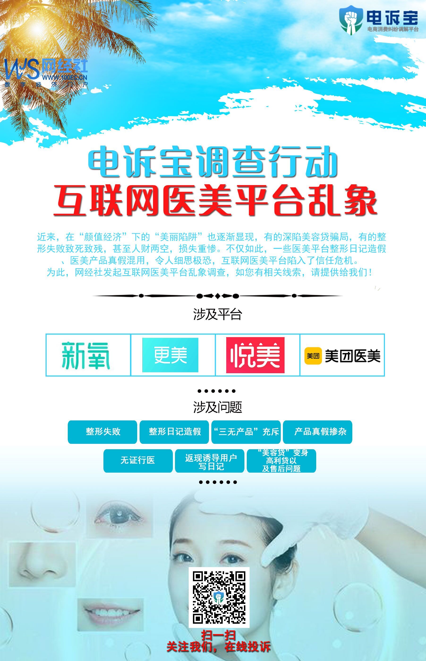 据国内知名网络消费纠纷调解平台“电诉宝”(315.100EC.CN)调查发现,互联网医美平台涉及用户投诉案例不少,其中新氧、更美两家平台用户投诉较为集中,也有涉及悦美APP、美团医美等平台。此外整形失败、整形日记造假、药品乃“三无”产品、产品真假掺杂、无证医生、返现诱导用户写日记、“美容贷”变身高利贷以及售后问题成为八大热点投诉问题。如您有互联网医美平台乱象相关线索,请提供给我们。