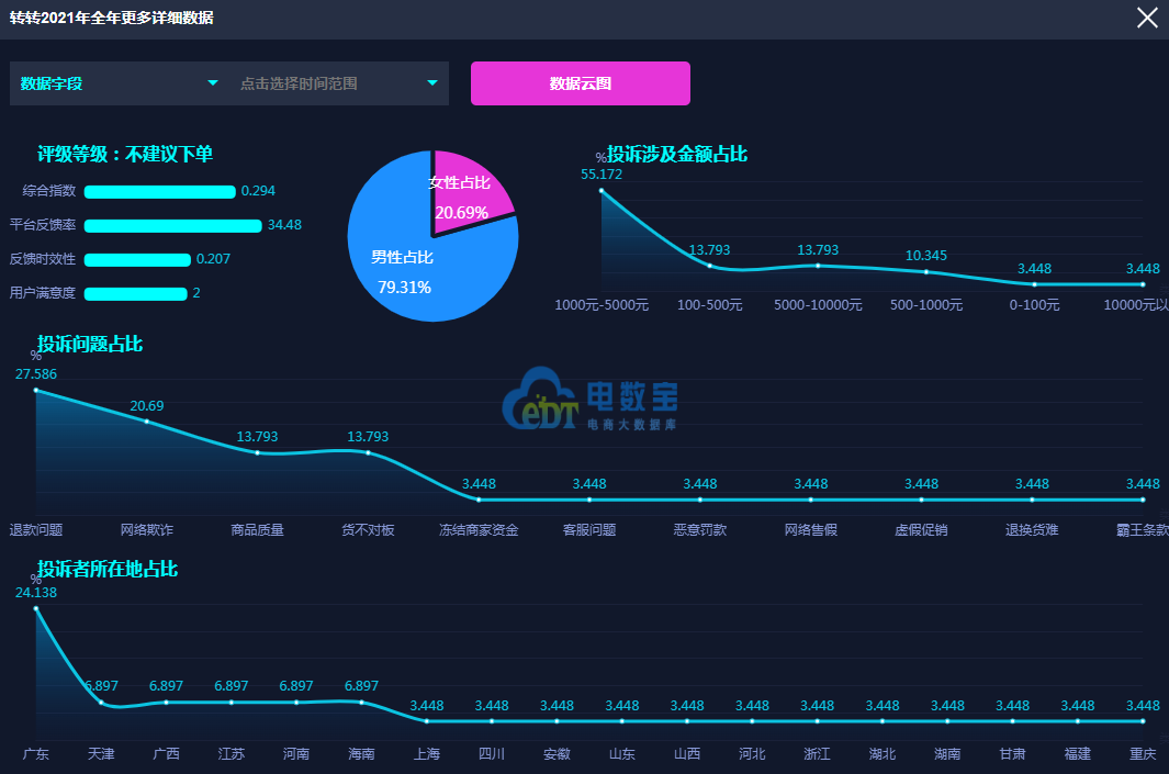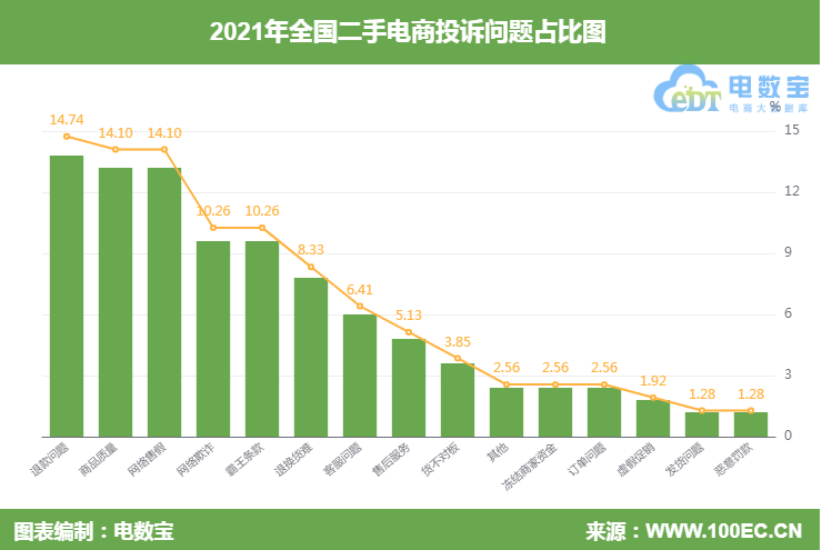国内知名网络消费纠纷调解平台“电诉宝”(315.100EC.CN)显示,退款(14.74%)、商品质量(14.1%)、网络售假(14.1%)、网络欺诈(10.26%)、霸王条款(10.26%)、退换货难(8.33%)、客服服务(6.41%)、售后服务(5.13%)、货不对板(3.85)、冻结商家资金(2.56%)、订单不符(2.56%)是2021年全年二手电商投诉的十大问题。