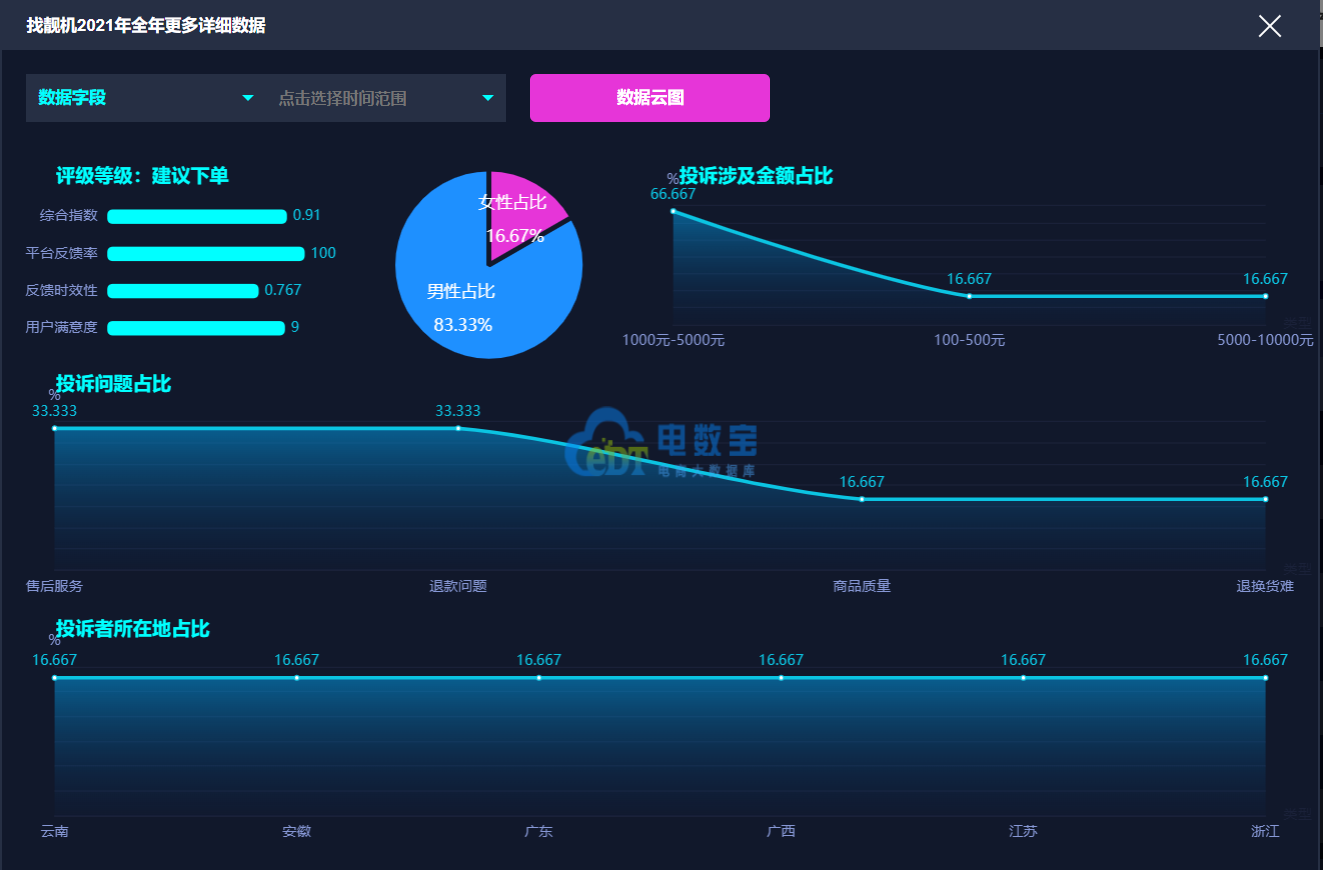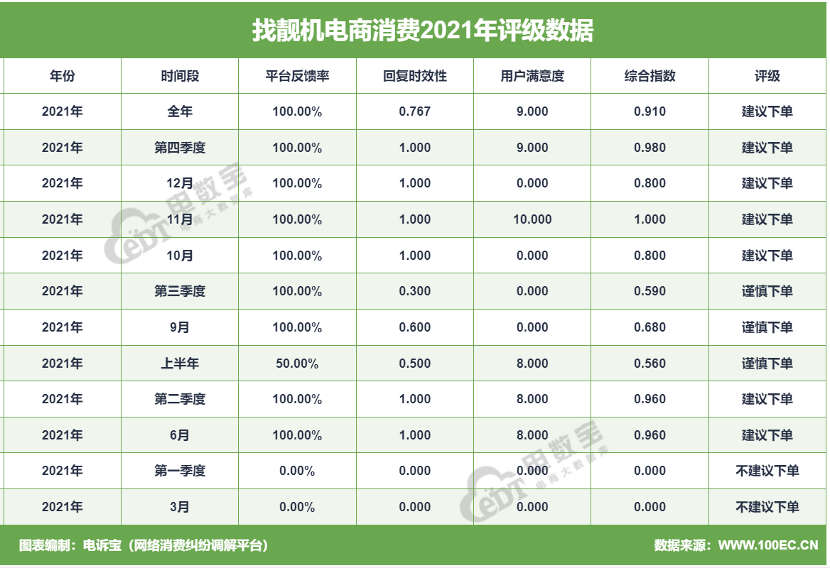据网经社旗下电商大数据库“电数宝”监测数据显示,“找靓机”(由深圳市万事富科技有限公司运营)2021年共获得12次消费评级,其中,7次获“建议下单”评级、3次获“谨慎下单”评级、2次获“不建议下单”评级,2021年获“建议下单”评级。